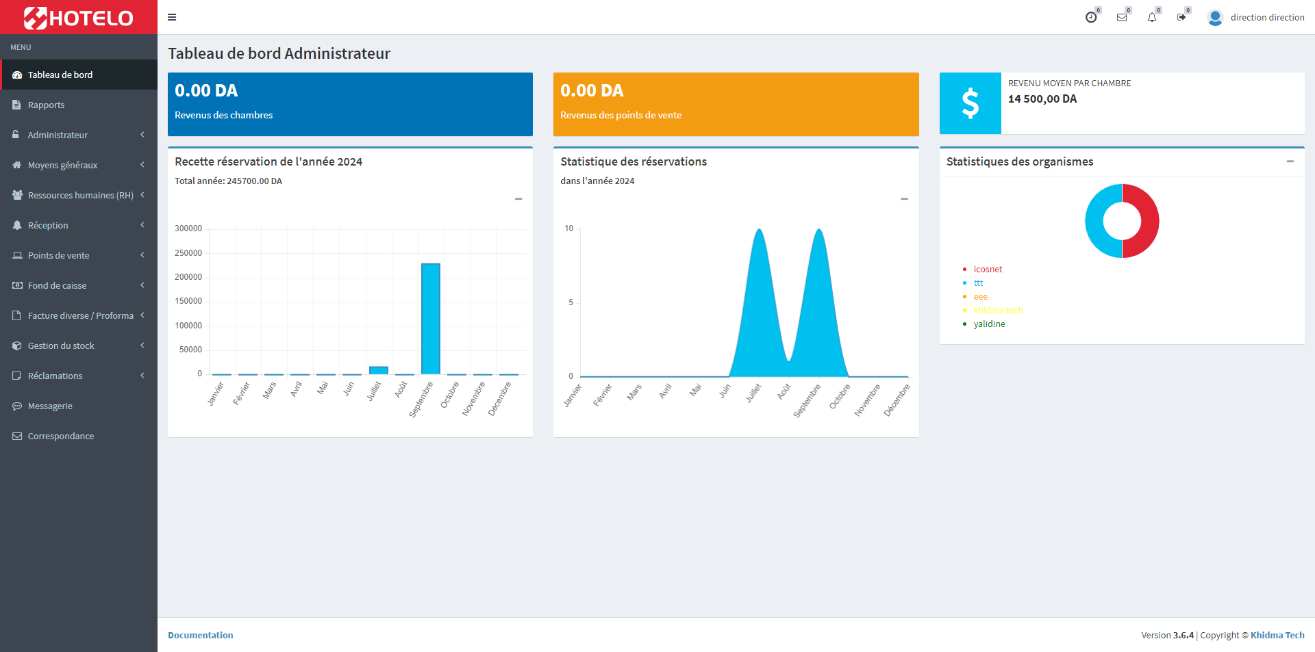 Dans le tableau de bord de l'administrateur, on trouve une vue générale des opérations essentielles concernant la gestion de l'hôtel.