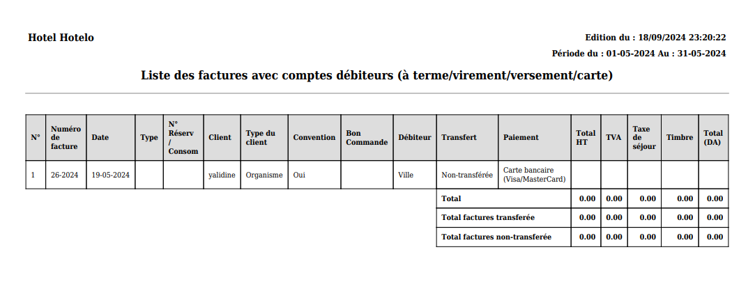 2. Liste des factures avec comptes débiteurs (à terme/virement/versement/carte)